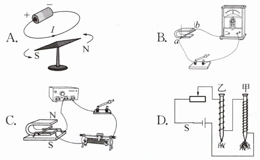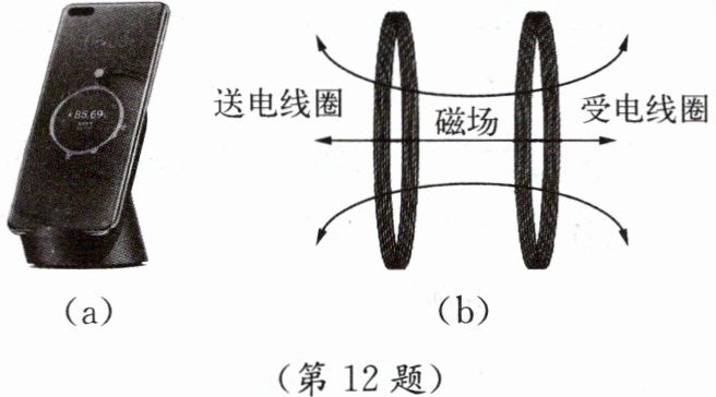 12. 无线充电的大致过程:电流通过充电座的“送电线圈”时会产生磁场,当手机中的“受电线圈”靠近这个磁场时,就会产生感应电流,从而给手机电池充电,如图所示。下列选项中的实验与“受电线圈”处用到的物理原理相同的是(