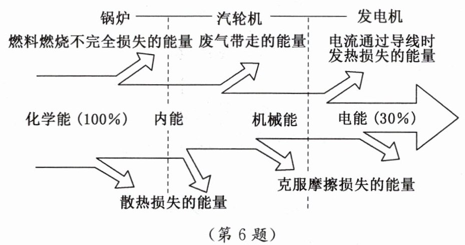 6. 从能量转化的角度,可以把火力发电站分为三个部分:锅炉、汽轮机和发电机。如图所示是火力发电站的能流图。