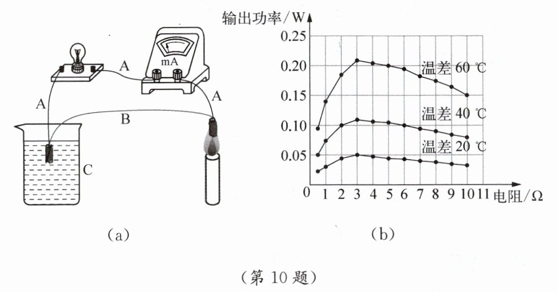 。(3)根据图像可以看出:温差一定时,随着电阻的增大,输出功率