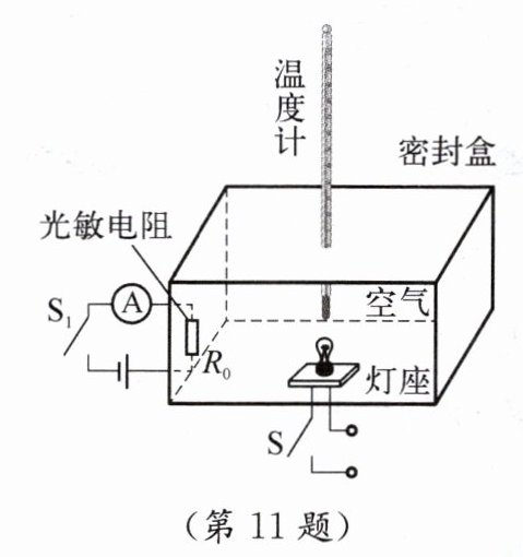 11. LED灯是一种节能光源。为了比较LED灯、白炽灯和荧光灯的发光效率,小明用如图所示的装置进行实验($R_0$为光敏电阻,其电阻值与光照度成反比)。实验过程如下:① 先把“220 V 15 W”的白炽灯接入灯座,使灯泡与温度计玻璃泡的距离约为2 cm,灯泡与光敏电阻的距离约为30 cm;② 闭合开关S和$S_1$,通电10 min,分别读出温度计和电流表的示数,并填入表中;③ 把“220 V 15 W”的荧光灯和LED灯分别接入灯座,重复上述实验。