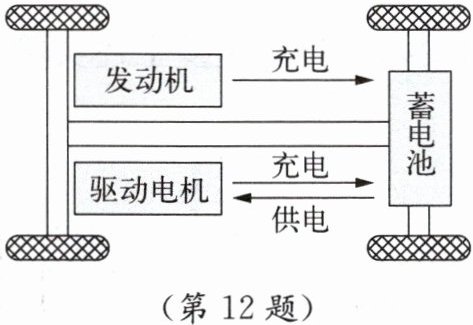 12. 某油电混合动力汽车的工作原理如图所示。当它以90 km/h的速度匀速行驶10 min的过程中,发动机和驱动电机共同为汽车提供动力。驱动汽车行驶所需要的能量$E_1 = 3 × 10^7$ J,其中60%来自汽油燃烧,而汽油燃烧放出热量的40%用于驱动汽车行驶和对蓄电池充电,其中用于对蓄电池充电的能量$E_2 = 2 × 10^6$ J。设汽油在发动机气缸内完全燃烧,汽油的热值$q = 5 × 10^7$ J/kg。