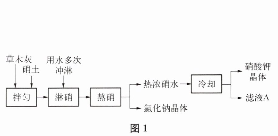 。(2) 熬硝主要是将淋硝过程中得到的硝水浓缩成浓硝水。根据图 2 中的溶解度曲线分析,冷却热浓硝水,主要获得 KNO₃晶体的原因是
