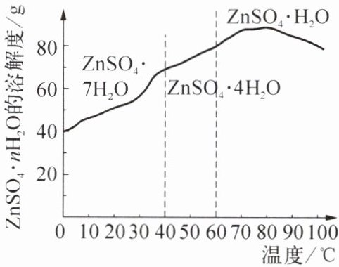 (填化学式)。(5) 硫酸锌晶体的溶解度曲线如右图所示,若要获得 ZnSO₄·7H₂O 晶体,应控制结晶时的温度范围为