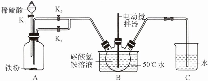 (填“K₁”“K₂”或“K₃”),并关闭其他开关,反应过程中控制装置 B 的温度在 50℃左右,原因是防止碳酸氢铵受热分解