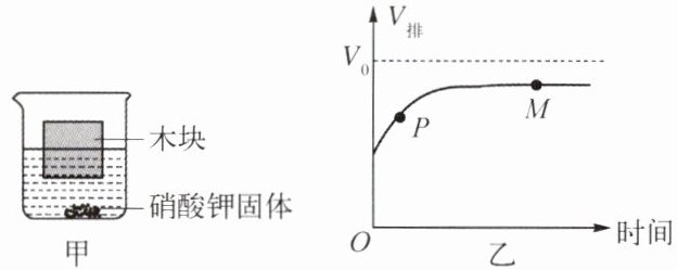 6. 一块体积为$V_{0}$的木块漂浮于装有硝酸钾溶液(有部分硝酸钾固体未溶解)的小烧杯中,如图甲所示。当温度改变时(不考虑由此引起的木块和溶液体积的变化),木块排开水的体积$V_{排}$随时间的变化如图乙所示。下列有关说法错误的是(