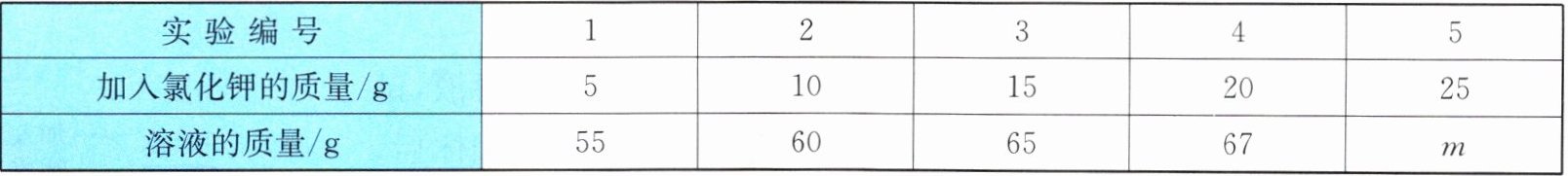 9. 在 20℃时,向质量均为 50g 的 5 份水中分别加入一定质量的氯化钾固体,然后搅拌至完全溶解得到溶液(如有不溶解的氯化钾,则过滤除去)。加入氯化钾的质量与所得溶液的质量见下表。