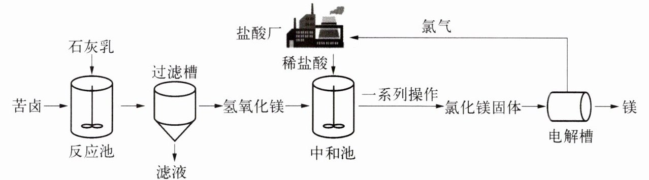 8. 镁被誉为“21 世纪最具开发应用潜力、绿色的战略性原材料”。用海水晒盐得到苦卤(含 MgCl₂、NaCl 等物质),从苦卤中提取镁的部分流程如下图所示。回答下列问题(已知氯化镁能与氢氧化钙反应生成氢氧化镁沉淀和氯化钙)。