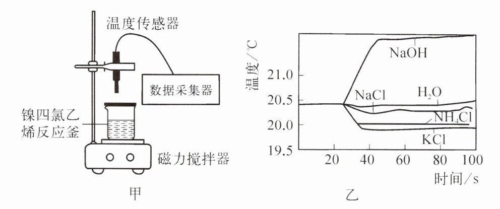9. 为了探究常见物质溶于水的过程是吸热还是放热,某项目化学习小组用图甲装置进行了如下实验:① 在室温下,往反应釜(一种容器)中加入90mL蒸馏水,再往反应釜中加入0.400gNaOH固体;② 立刻盖上反应釜的盖子,开启磁力搅拌器和数据采集器,采集反应釜内的温度数据,持续100s;③ 清洗反应釜,然后用下表所示的其他种类药品及其对应的质量更换下一种药品,重复步骤①②,直到所有药品采集结束。实验过程的温度变化曲线如图乙所示。