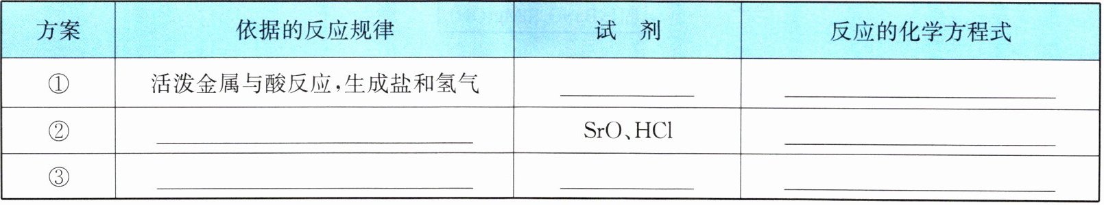 (2) 已知金属锶(${Sr}$)的活动性强于镁。请设计三种制备氯化锶的方案(要求含锶原料分别属于不同的物质类别)。完成下表: