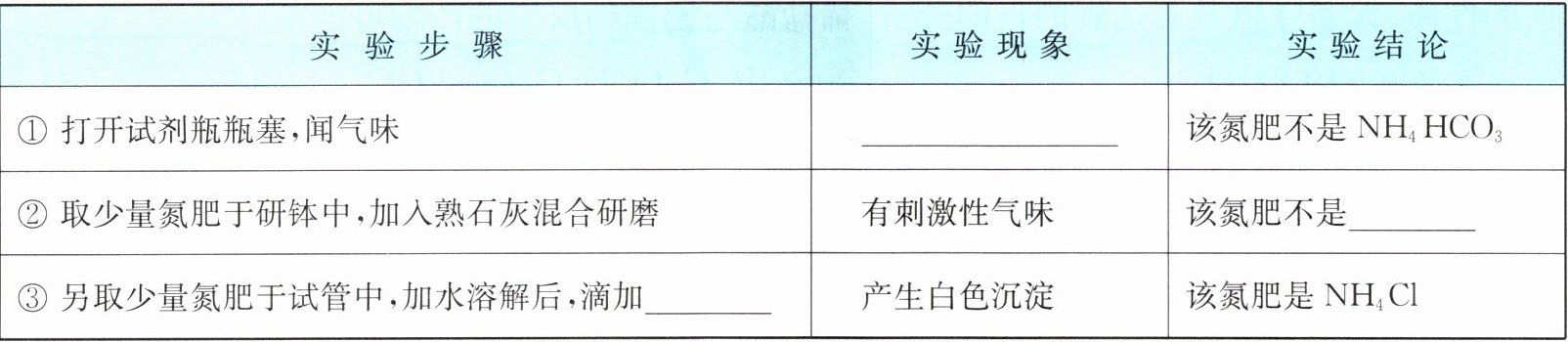 (3) 脐橙种植初期的肥料以氮肥为主。小组同学发现实验室有一瓶标签残缺的氮肥,经询问实验老师,得知该氮肥是 $ \mathrm{CO}(\mathrm{NH}_2)_2 $ (尿素)、$ \mathrm{NH}_4\mathrm{NO}_3 $、$ \mathrm{NH}_4\mathrm{Cl} $、$ \mathrm{NH}_4\mathrm{HCO}_3 $ 中的一种。为鉴别该氮肥,进行了如下实验。