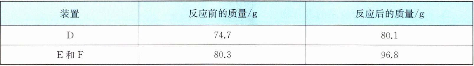 加热前后分别称量装置D、E和F的质量。实验数据如下表。
