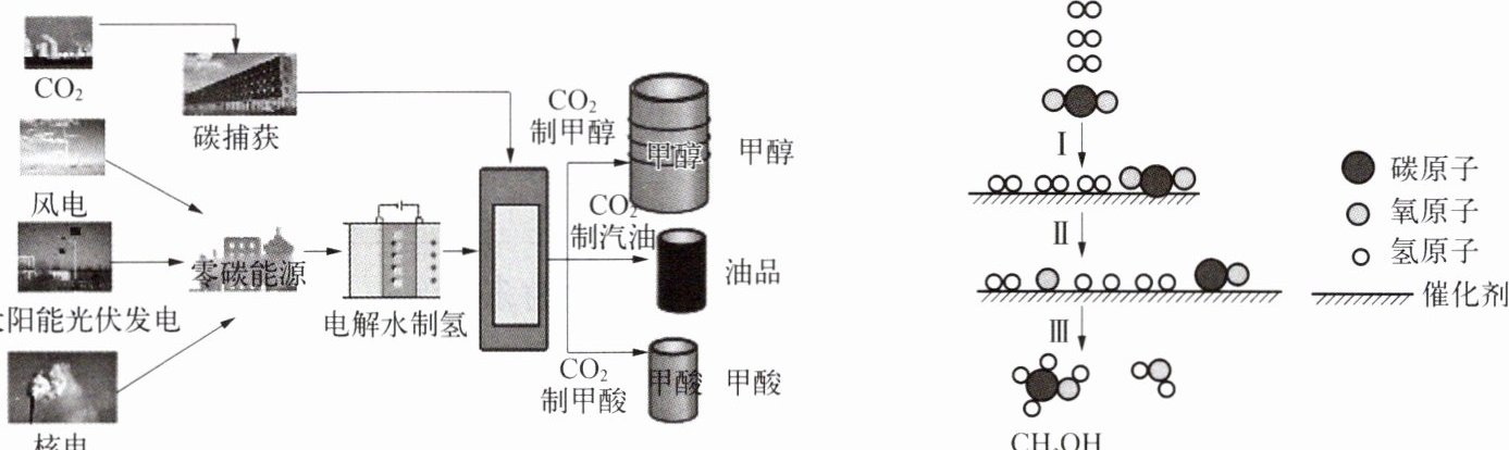 。(4)图 2 是在催化剂作用下,${CO_{2}}$制甲醇(${CH_{3}OH}$)的微观过程示意图。过程Ⅱ“”分成的两种粒子名称是