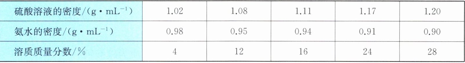 10. 溶液的配制是日常生活和化学实验中的常见操作。硫酸溶液和氨水的密度与其溶质质量分数对照表如下(20℃)。