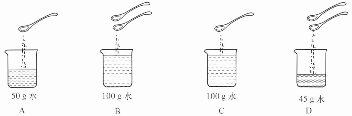 11. 两个同学在家中做了如下图所示实验:在 A、B、C、D 四个烧杯的水中加入食盐(每勺食盐质量均为 5 g),待食盐完全溶解后,所得溶液中溶质质量分数相等的是