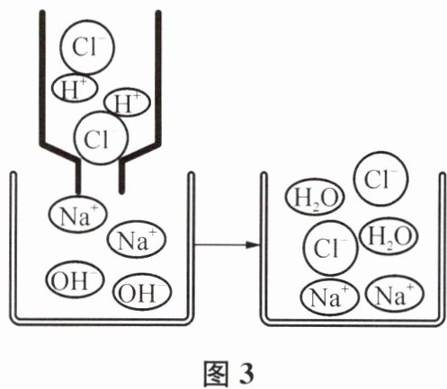 (填化学式)。类比图3的反应实质写出溴化氢的水溶液与氢氧化钠反应的化学方程式:$HBr + NaOH = NaBr + H_2O$