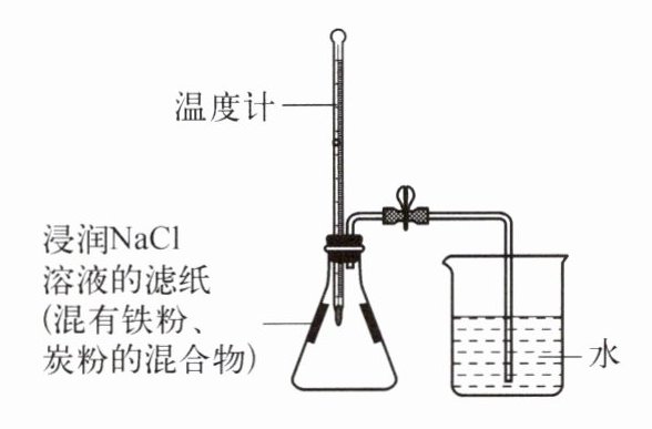 。③ 利用铁粉、炭粉、氯化钠进行铁的锈蚀实验(装置如下图所示,装置气密性良好)。实验 1 min 后温度计读数上升,8 min 后打开止水夹,水倒吸入锥形瓶。实验数据如下表: