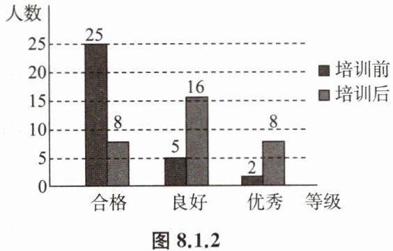 例 为加强劳动教育,某校开设了劳动技能培训课程.为了解培训效果,学校对七年级 320 名学生在培训前和培训后各进行一次劳动技能检测,两次检测项目相同,评委依据同一标准进行现场评估,分成“合格”“良好”“优秀”3 个等级,依次记为 2 分、6 分、8 分.学校随机抽取 32 名学生的两次检测等级作为样本,绘制成如图的条形统计图: