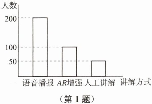 1. 博物馆为展品准备了人工讲解、语音播报和 AR 增强三种讲解方式,博物馆共回收有效问卷 1000 张,其中 700 人没有讲解需求,剩余 300 人的需求情况如图所示(一人可以选择多种).在总共 2 万人的参观中,约有多少人需要 AR 增强讲解?