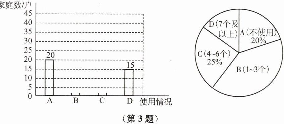 3. 学校环保调查小组就某小区每户家庭 1 周内环保塑料袋的使用情况进行了抽样调查,使用情况为 A(不使用)、B(1~3 个)、C(4~6 个)、D(7 个及以上),以下是根据调查结果绘制的统计图的一部分.