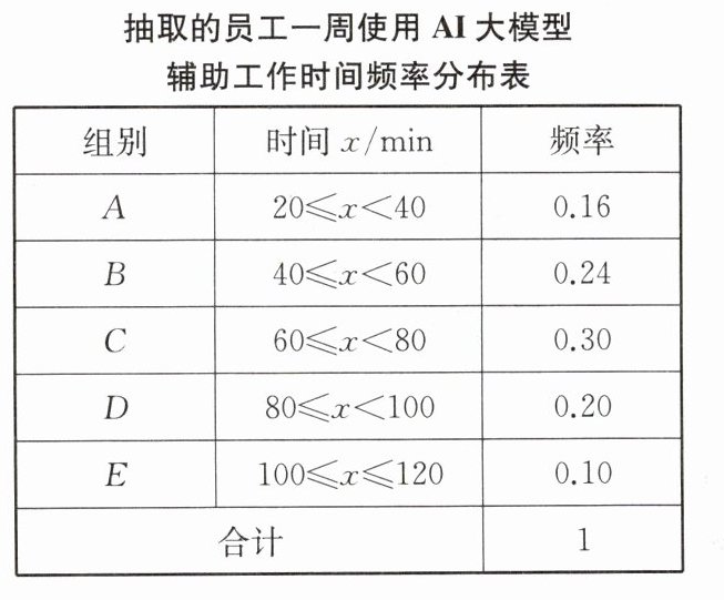 5. 某学习小组采用简单随机抽样的方法,对某公司员工一周使用 AI 大模型辅助工作的时间进行了抽样调查,把所得的数据分组整理,并绘制成频数分布直方图: