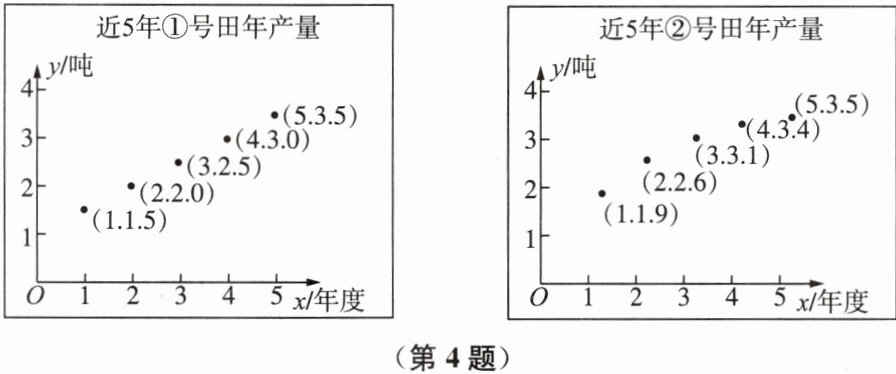 4. 某地种植水稻获得突破性进展,小华和小莹到水稻种植基地调研。小莹根据水稻年产量数据,分别在直角坐标系中描出表示 2019—2023 年①号田和②号田年产量情况的点(记 2019 年为第 1 年度,横轴表示年度,纵轴表示年产量),如下图。