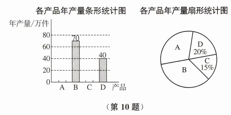 10. 某厂为提升产品竞争力,对 $ A $、$ B $、$ C $、$ D $ 四种产品的生产模式进行调整,调整会影响产品的成本.该厂做出了甲、乙两种调整方案,调整前各产品年产量的不完整的条形统计图和扇形统计图如图所示.在各产品单件成本的核算情况统计表中,方案甲的四种产品成本平均数与调整前的相同,方案乙的四种产品成本中位数与调整前的相同.根据以上信息,回答下列问题: