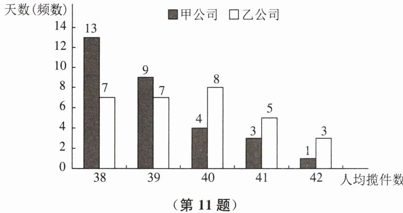 11. 甲、乙两家快递公司揽件员的工资方案如下:甲公司为“基本工资 + 揽件提成”,其中基本工资为 70 元/日,每揽收 1 件提成 2 元;乙公司无基本工资,仅以揽件提成计算工资.若当日揽件数不超过 40,每件提成 4 元;若当日揽件数超过 40,超过部分每件多提成 2 元.下图是去年 4 月份甲公司揽件员人均揽件数和乙公司揽件员人均揽件数的条形统计图: