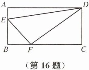 16. (8分)如图,在矩形 $ ABCD $ 中,$ AB = 3 $,$ BC = 6 $,动点 $ E $ 从点 $ A $ 出发,以每秒1个单位长度的速度向点 $ B $ 运动;动点 $ F $ 从点 $ B $ 出发,以每秒2个单位长度的速度向点 $ C $ 运动。求 $ \triangle DEF $ 的面积 $ S $ 与运动时间 $ t $ 之间的函数表达式,并指出当 $ t $ 取何值时,$ \triangle DEF $ 的面积 $ S $ 取得最小值。