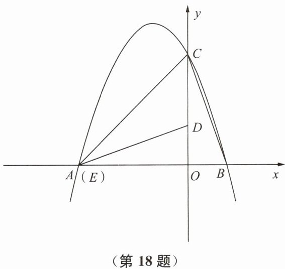 18. (10分)如图,二次函数 $ y = ax^2 + bx + c $ 的图像交 $ x $ 轴于点 $ A $、$ B $,交 $ y $ 轴于点 $ C $。且点 $ B $ 的坐标为 $ (1,0) $,若将 $ \triangle BOC $ 绕点 $ O $ 按逆时针方向旋转 $ 90° $,所得 $ \triangle DOE $ 的顶点 $ E $ 恰好与点 $ A $ 重合,且 $ \triangle ACD $ 的面积为3。