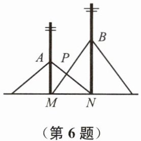 6. 如图,两根相邻的电线杆都用钢索固定在地面上,钢索一端至电线杆底部的高度$AM = 4\ \mathrm{m}$,$BN = 6\ \mathrm{m}$.两钢索相交处点$P$离地面的高度是(