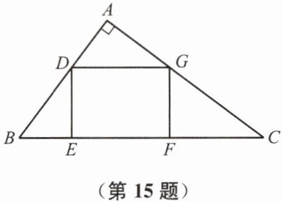 15. (8分)如图,在$\triangle ABC$中,$\angle A = 90^{\circ}$,$AB = 12\ \mathrm{cm}$,$AC = 16\ \mathrm{cm}$,矩形$DEFG$的顶点都在$\triangle ABC$的边上,且$DE:EF = 3:5$.求矩形$DEFG$的周长.