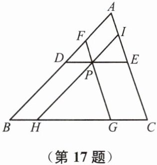 17. (10分)如图,点$P$在$\triangle ABC$的内部,点$F$、$D$在$AB$上,点$E$、$I$在$AC$上,点$H$、$G$在$BC$上,$FG // AC$,$HI // AB$,$DE // BC$,且$\triangle FDP$、$\triangle IPE$、$\triangle PHG$的面积分别为$4$、$9$和$49$.求$\triangle ABC$的面积.