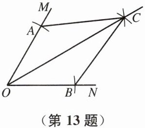 13. (10分)如图,∠MON=60°,以O为圆心,2为半径画弧,分别交OM、ON于A、B两点,再分别以A、B为圆心,$\sqrt{6}$为半径画弧,两弧在∠MON内部相交于点C,作射线OC,连接AC、BC,求$\tan\angle BCO$的值。