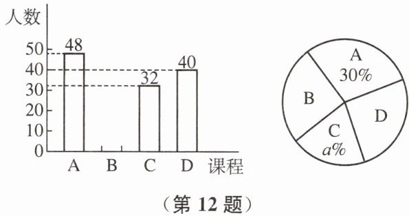 12. 某校准备开设以下特色课程:A-泥塑,B-锡剧,C-精微绣,D-竹刻.为了解学生最感兴趣的课程情况,从全校学生中随机抽取部分学生进行调查(每位学生必选且只能选一个课程),根据调查结果,绘制了如下两幅不完整的统计图,根据提供的信息,解答下列问题: