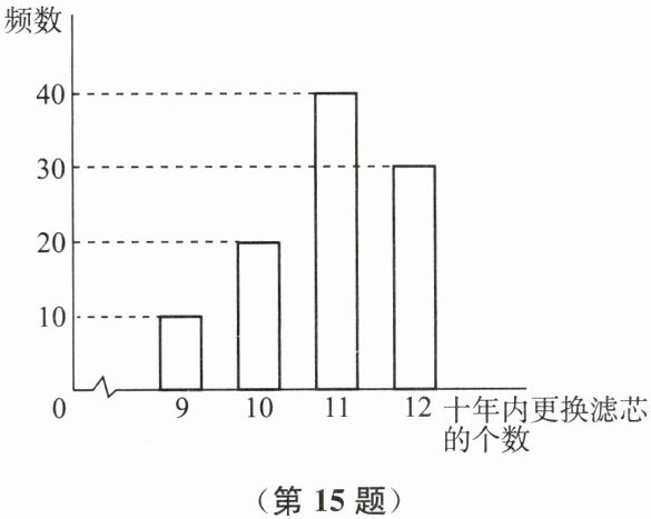 15. 某款净水器使用寿命为十年,它的过滤功能主要由滤芯来实现.在使用过程中,需要不定期更换滤芯,每个滤芯200元.若在购买净水器的同时一次性购买多个滤芯,则滤芯可享受5折优惠;若在购买净水器之后再购买滤芯,则没有优惠;若购买的滤芯未使用,则按每个50元回收.如图是根据100位客户所购买的该款净水器在十年内更换滤芯的个数绘制的频数分布直方图.