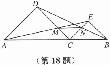 18. 如图,$C$ 是线段 $AB$ 上的任意一点(端点除外),分别以 $AC$、$BC$ 为斜边并且在 $AB$ 的同一侧作等腰直角三角形 $ACD$ 和等腰直角三角形 $BCE$,连接 $AE$,交 $CD$于点 $M$,连接 $BD$,交 $CE$ 于点 $N$。则: