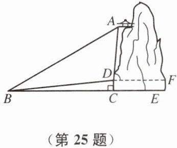 25. (10 分)某景区有一个景观奇异的天门洞,点 $D$ 是洞的人口,游人从人口进洞游览后,可经山洞到达山顶的凉亭 $A$ 处观看旅游区风景,最后坐缆车沿索道 $AB$返回山脚下的 $B$ 处。在同一平面内,若测得斜坡 $BD$ 的长为 $1000m$,坡角$\angle DBC = 5^{\circ}$,在 $B$ 处测得凉亭 $A$ 的仰角$\angle ABC = 35^{\circ}$,在 $D$ 处测得凉亭 $A$ 的仰角$\angle ADF = 80^{\circ}$,过点 $D$ 作地面 $BE$ 的垂线,垂足为 $C$。