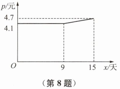 8. 某企业接到一批生产粽子的任务,要求在 15 天内完成,约定粽子的出厂价为每只 6 元. 为按时完成任务,该企业招收了新工人. 设新工人李明第 $ x $ 天生产的粽子数量为 $ y $ 只,$ y $ 与 $ x $ 满足关系式:$ y = \begin{cases} 54x(0 \leqslant x \leqslant 5), \\ 30x + 120(5 < x \leqslant 15). \end{cases} $