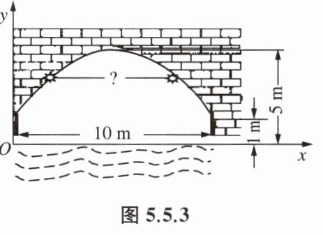 例 1 图 5.5.3 是一座古拱桥的截面图,拱桥桥洞上沿是抛物线形状,抛物线两端点与水面的距离都是1 m,拱桥的跨度为10 m,桥洞与水面的最大距离是5 m,桥洞两侧壁上各有一盏距离水面4 m的景观灯.建立如图所示的平面直角坐标系.