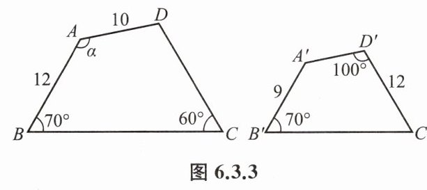 例 3 如图 6.3.3,四边形 ABCD 与四边形 A'B'C'D'相似,求相似比、CD 和 A'D'的长及α的大小.