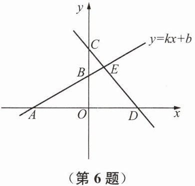 6. 如图,已知一次函数 $ y = kx + b $ 的图像与 $ x $ 轴交于点 $ A(-3,0) $,与 $ y $ 轴交于点 $ B $,与直线 $ CD $ 交于第一象限内点 $ E $ 处,且点 $ C $ 的坐标为 $ (0,4) $,点 $ D $ 的坐标为 $ (4,0) $,$ AB : BE = 3 : 1 $.求 $ k $、$ b $ 的值.