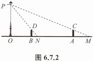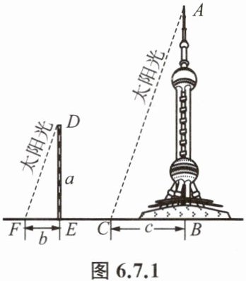 例 1 如图 6.7.1,在同一时刻的太阳光下,测出垂直于地面的长 $a$ m 的标杆的影长为 $b$ m,塔的影长为 $c$ m. 请你求出塔的高度.