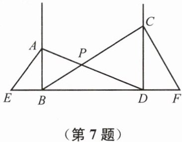 7. 如图,工地上竖立着两根电线杆 AB、CD.现分别自两杆上的点 A、C 处向两侧地面上的点 E、D 和点 B、F 引钢丝绳并拉紧,以固定电线杆.已知 AB=4 m,CD=6 m,求钢丝绳 AD 与 BC 的交点 P 离地面的高度.