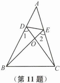 11. 如图,点 $D$、$E$ 分别在$\triangle ABC$ 的边 $AB$、$AC$ 上,$BE$、$CD$ 相交于点 $O$,$\angle 1=\angle 2$,连接 $DE$. 图中共有多少对相似三角形?请把它们写出来.