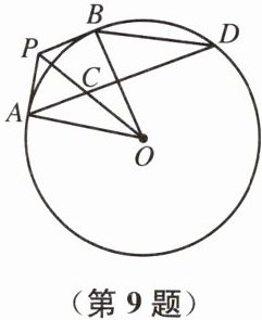 9. 如图,过点 $ P $ 作 $ \odot O $ 的两条切线,切点分别为 $ A $、$ B $,连接 $ OA $、$ OB $、$ OP $,取 $ OP $ 的中点 $ C $,连接 $ AC $ 并延长,交 $ \odot O $ 于点 $ D $,连接 $ BD $.