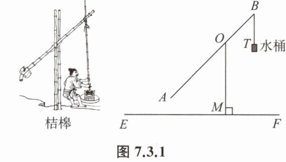 例 2 如图 7.3.1,桔槔是一种原始的汲水工具,在一根竖立的架子上置一根细长的杠杆,末端悬挂重物,前端悬挂水桶,就制成了桔槔。当人把水桶放入水中打满水以后,由于杠杆末端的重力作用,把水提升至所需处比较省力。若已知杠杆 $AB = 6m$,$AO:OB = 2:1$,支架 $OM⊥ EF$,$OM = 3m$,$AB$ 可以绕着点 $O$ 自由旋转,当点 $A$ 旋转到如图所示位置时,$\angle AOM = 45^{\circ}$,求此时点 $B$ 到水平地面 $EF$ 的距离。
