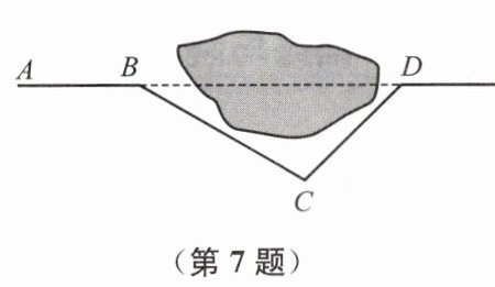7. 如图,甲施工队沿 $AB$ 方向在一湖泊上架桥修路,为加快施工进度,乙施工队在湖另一边的点 $D$ 处同时施工。已知点 $D$ 在直线 $AB$ 上,且在点 $C$ 处测得 $\angle ABC = 150^{\circ}$,$BC = 1600m$,$\angle BCD = 105^{\circ}$,求 $B$、$D$ 两点的距离。