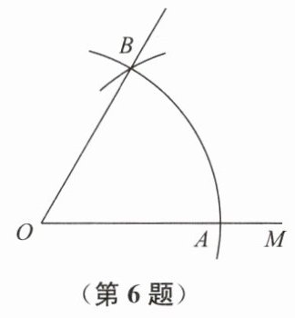 6. 如图,以点 $O$ 为圆心,任意长为半径画弧,与射线 $OM$ 交于点 $A$,再以点 $A$ 为圆心,$AO$ 长为半径画弧,两弧交于点 $B$,画射线 $OB$,求 $\tan\angle AOB$ 的值。