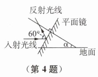 4. 如图,一束光水平照射在有一定倾斜角度的平面镜上,若入射光线与反射光线的夹角为 $60^{\circ}$,则平面镜的垂线与水平地面的夹角 $\alpha$ 的余弦值为