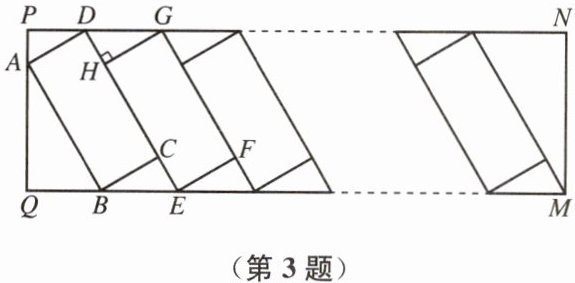 3. 为满足新能源汽车的充电需求,某小区增设了充电站. 如图是矩形 $ PQMN $ 充电站的平面示意图,充电站有若干个矩形停车位,所有停车位大小相同且并列排放,图中的矩形 $ ABCD $ 是其中一个停车位. 经测量,$ \angle ABQ = 60° $,$ AB = 5.4 \mathrm{ m} $,$ CE = 1.6 \mathrm{ m} $,$ GH ⊥ CD $.